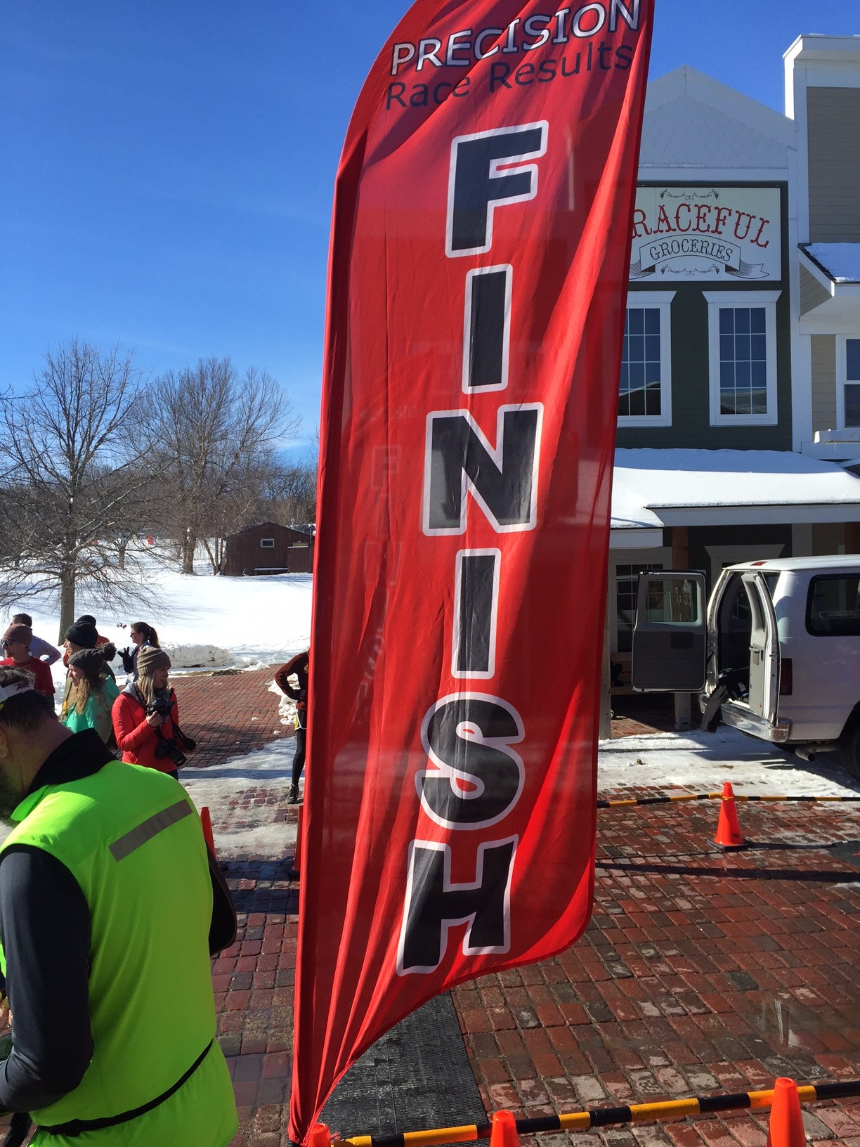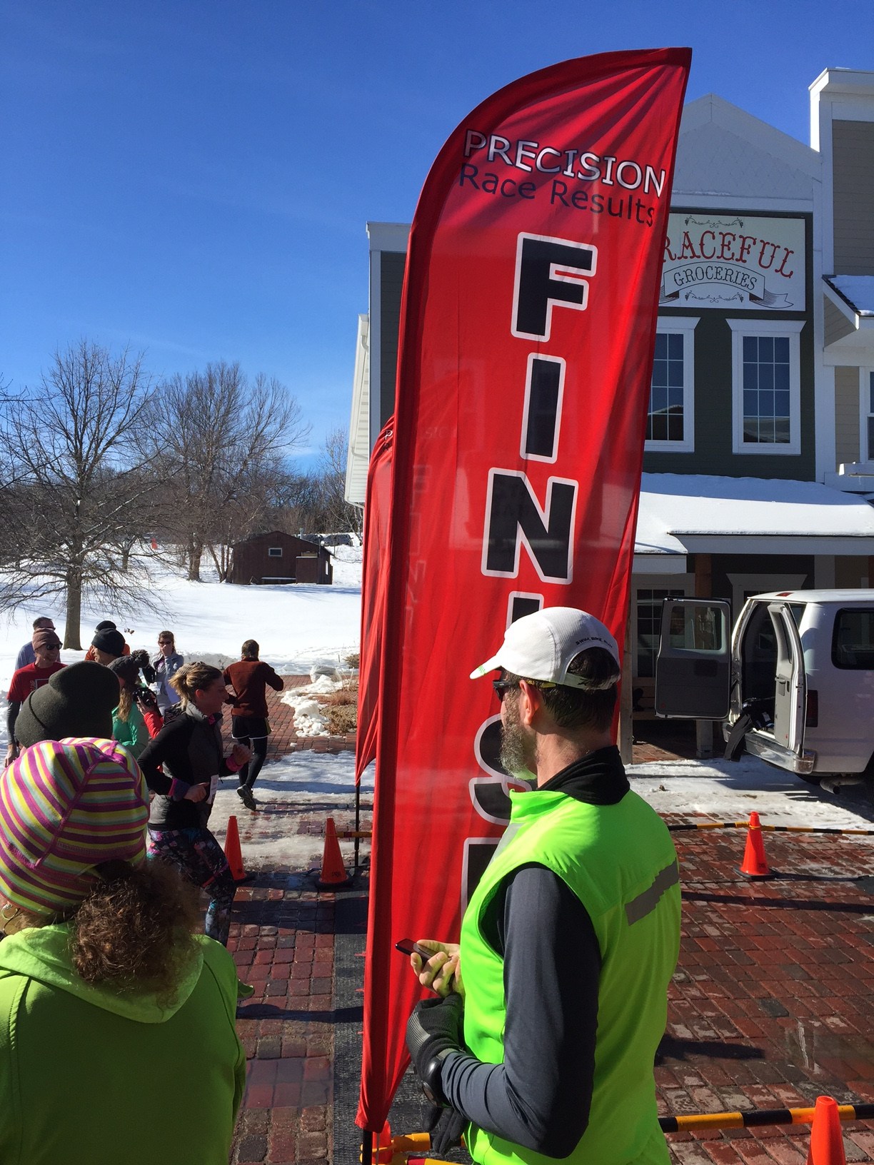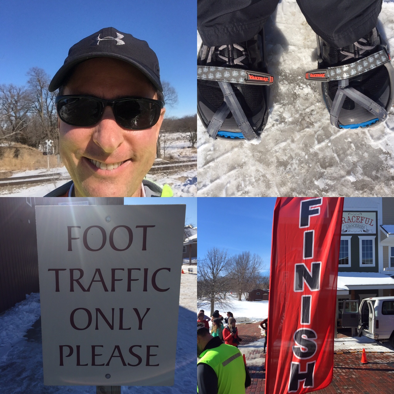 Early that morning, I arrived to pick up my packet and walk/run around a little. I debated whether or not to race in Yaktrax for the first time (have run in Yaktrax a lot, just hadn’t raced in them yet). Finally I decided that would be necessary noticing there was a lot of snow and ice still on the ground, a little more snow than Lincoln got recently. I selected the Topo Athletic MT trail shoes for the race, zero-drop good trail shoes that I have run a full trail marathon in before so I knew they could perform. I almost wore my Mizuno Wave Kazans for the race but decided that the Topos would be lighter and faster for a shorter race.