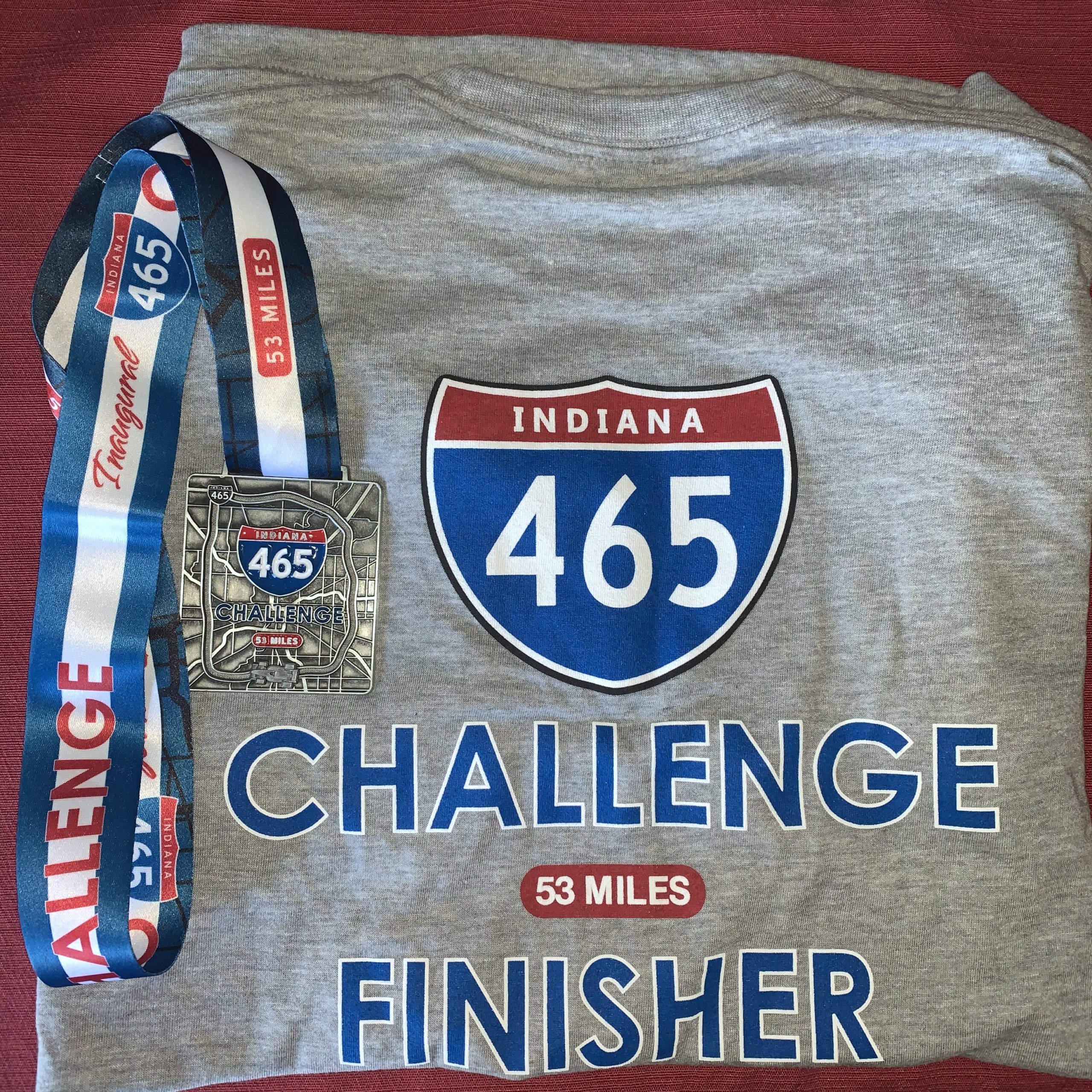 Finally, at the end of the challenge, finishers receive an awesome finisher shirt with 465 challenge finisher and the I-465 logo on it as well as a superb unique medal with a race car which drives all the way around the loop just to remind you how fun it was.